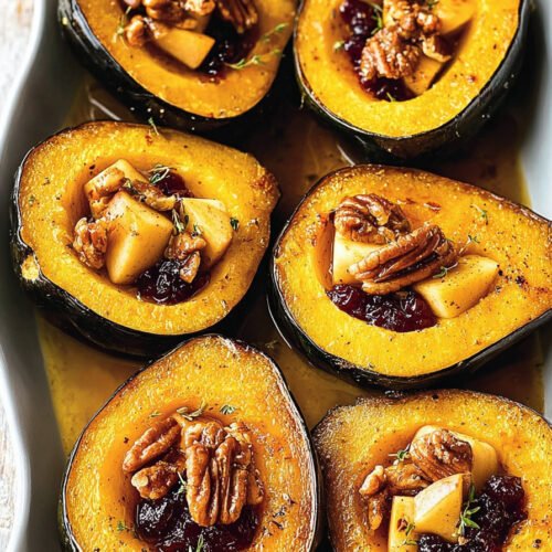 This acorn squash recipe stays simple. We use pantry fruit, warm spice, and a short bake. The flavor leans sweet and savory. The texture lands creamy.
