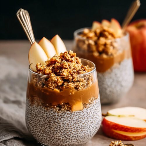 Leftovers are a blessing here. Store the chia pudding in jars or containers with lids and refrigerate for up to four days. Keep the crumble in a separate airtight container so it stays crunchy. When you’re ready to eat, layer them again and add a few fresh apple slices if you want to refresh the flavor.