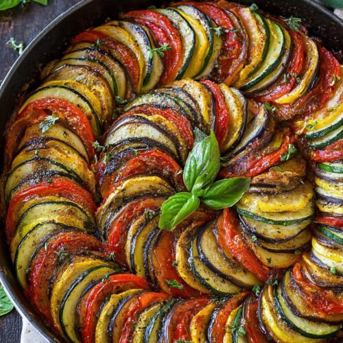 • This ratatouille recipe is a beautiful way to turn simple vegetables into a colorful, oven-baked dish that feels both rustic and elegant.