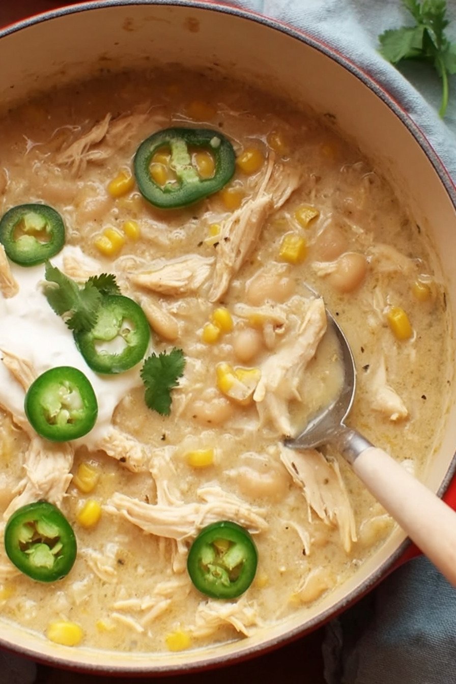 For the best texture, use tender shredded chicken rather than overly large chunks. Rotisserie chicken works especially well when you want a white chicken chili recipe easy enough for a quick weeknight dinner. If you are starting with raw chicken, simmer it gently so it stays juicy and shreds easily into the creamy broth.