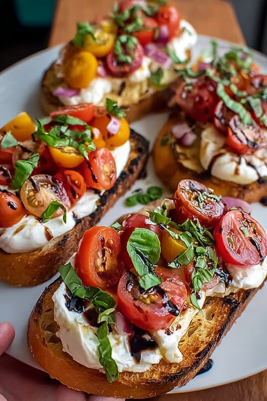 I call this my weeknight party trick. This bruschetta recipe keeps the toast crisp, the burrata soft, and the tomatoes bright. You taste sun on bread. You hear the crunch. You get that cool creamy finish and you might smile before you notice. We share a plate and it goes fast. That is the point. I start with warm bread. I rub garlic on the surface. I mix tomatoes with red onion, basil, olive oil, and a splash of balsamic. The mix rests and turns juicy. Then burrata lands on toast and the tomatoes pile on. A light drizzle of glaze ties it all together. This simple bruschetta recipe stays fresh and clean. It feels easy to make and easy to love. Use this for a small dinner with friends or a solo snack when the day runs long. I keep extra basil nearby for that peppery lift. For fun, try a mushroom bruschetta recipe on the side or swap in mozzarella for a caprese bruschetta recipe vibe. If you chase the best bruschetta recipe you will like this fresh bruschetta recipe too. I keep a burrata bowl ready because a bruschetta recipe mozzarella moment always wins.
