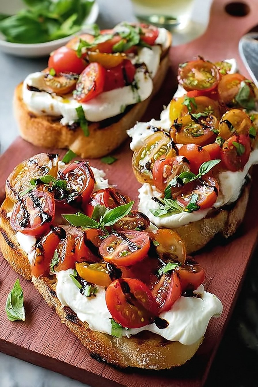 Re crisp bread in a warm pan for one minute per side. Add fresh burrata and spoon the mix on top for an authentic bruschetta recipe bite