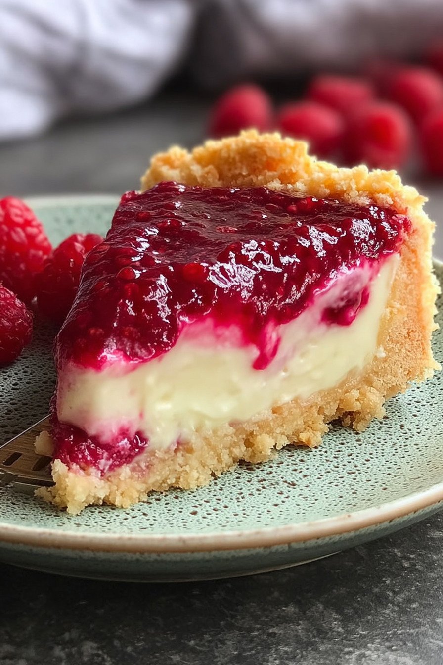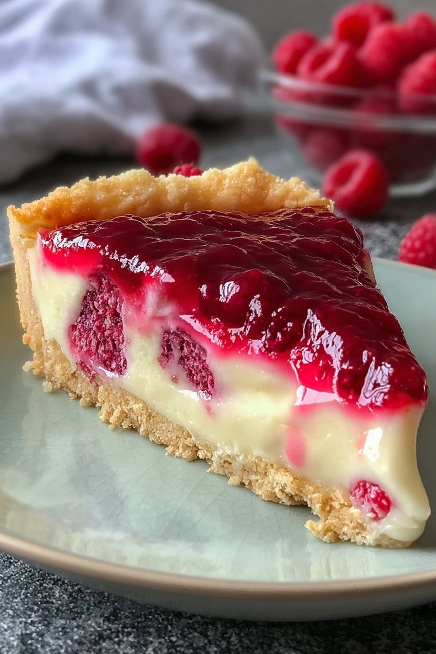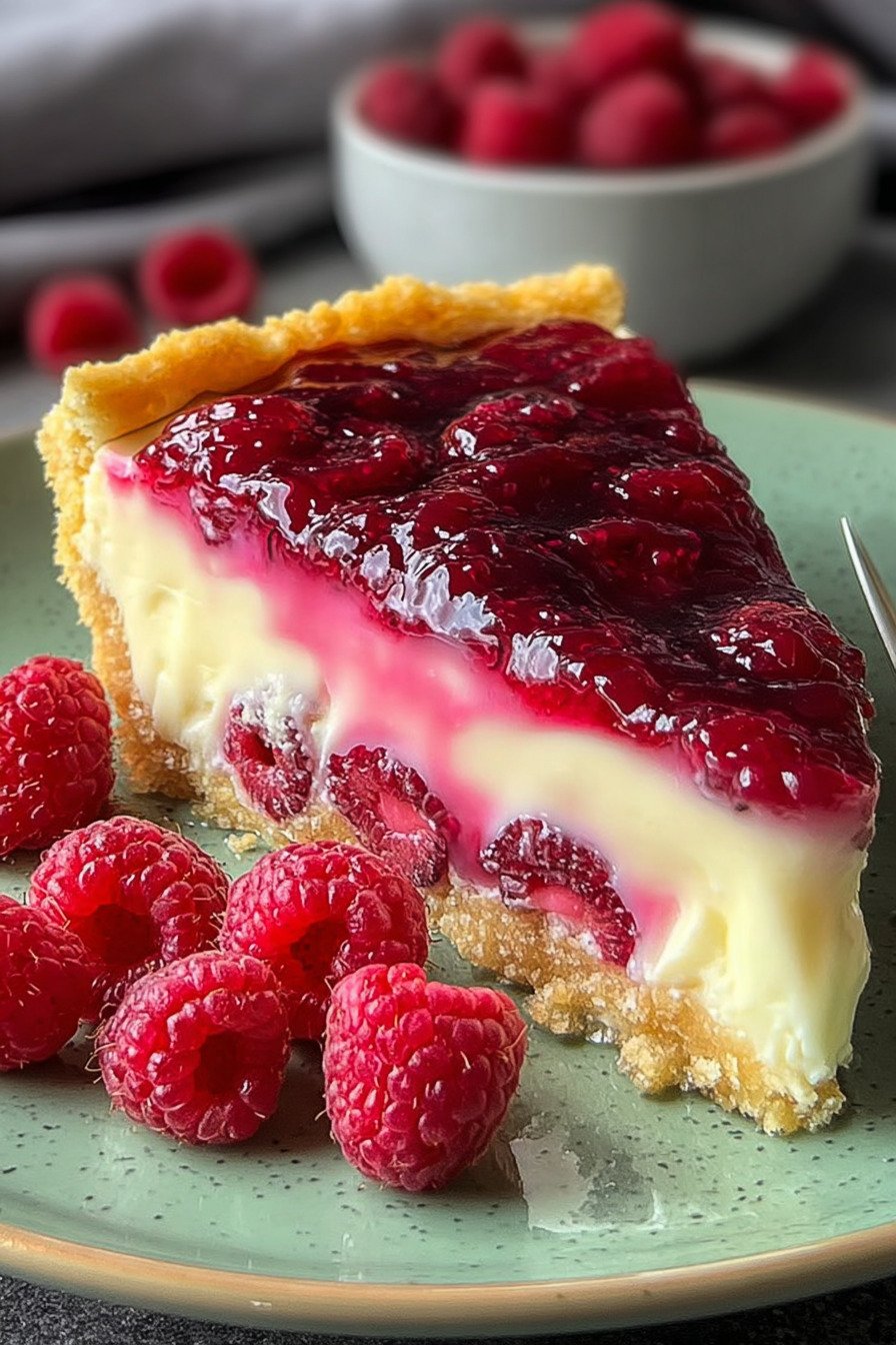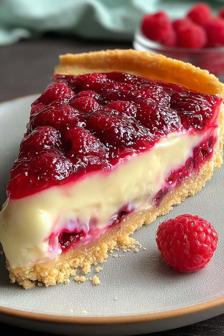 This dessert brings a crisp cookie base and a smooth creamy top. Fresh raspberries add bright notes. We bake low and slow for a soft center with a gentle wobble.