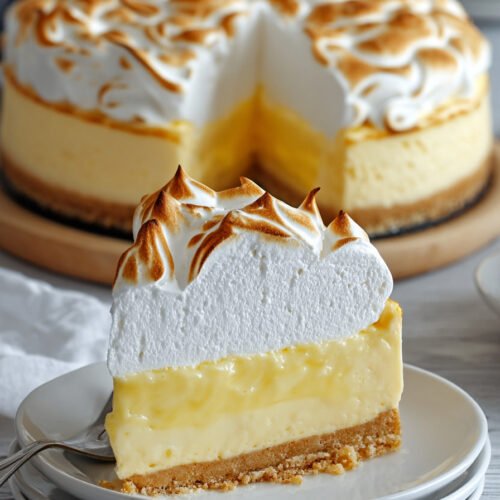 There’s something about lemon desserts that always feels like sunshine on a plate. This Lemon Meringue Cheesecake takes that brightness and adds creamy indulgence to it. Think of it as if your favorite lemon meringue pie and a classic cheesecake fell in love and decided to share their best traits. The result? A tangy, dreamy, and perfectly balanced dessert that’s smooth on the tongue and light on the soul. When I first made this, I wasn’t sure if it would hold up. But then that first bite hit — buttery crust, silky lemon curd, fluffy meringue — and I knew I had something special. You can serve this at a summer brunch, a family dinner, or honestly, any random Tuesday. Because cheesecake doesn’t wait for an occasion. It makes one. If you’ve ever wanted a dessert that looks impressive but feels comforting, this is it. And between us, this lemon meringue cheesecake recipe might just become your next signature dish.