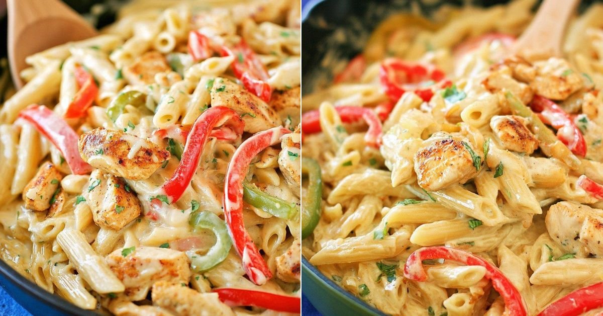 • This chicken fajita pasta recipe combines creamy Alfredo sauce, tender chicken, and colorful peppers for a bold and comforting dinner.