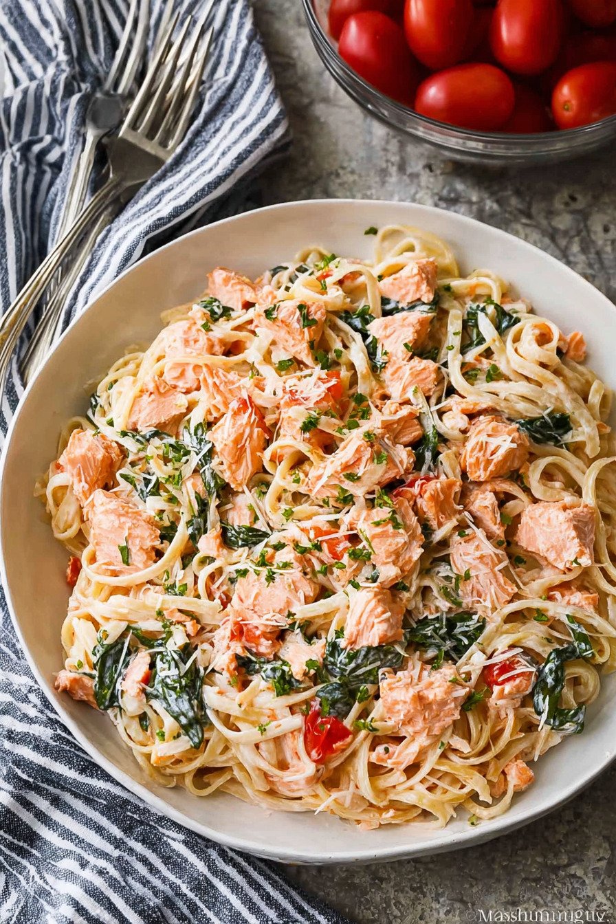 If you’re searching for comforting spinach dinner recipes that are both easy and satisfying, this Creamy Tomato Salmon Pasta is a perfect choice. The dish combines tender salmon, fresh spinach, and pasta tossed in a creamy tomato sauce that feels indulgent yet simple enough for a weeknight dinner. It’s a meal that brings together rich flavors and nourishing ingredients in a way that makes dinner feel special without requiring complicated steps.