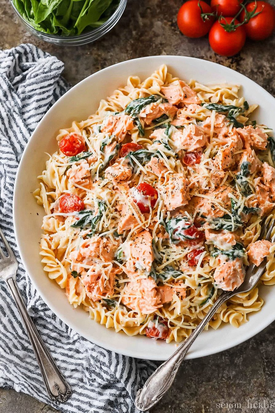 - This comforting pasta dish combines salmon, spinach, and a creamy tomato sauce for a rich and satisfying dinner.