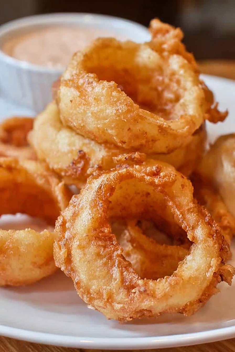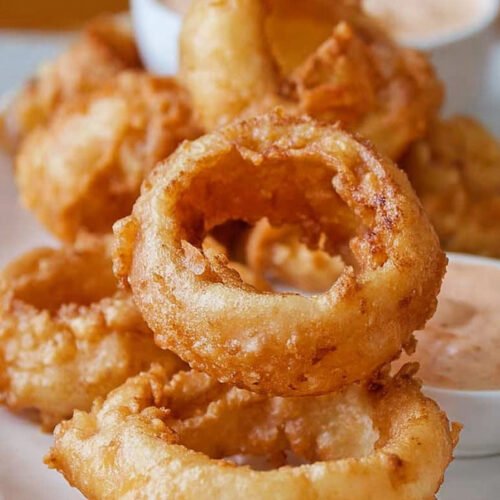 If you want to get ahead, slice the onions and separate the rings several hours in advance. Store them covered in the refrigerator so they are ready to dip and fry when needed. You can also mix the dry ingredients ahead of time, which makes the final prep much faster.