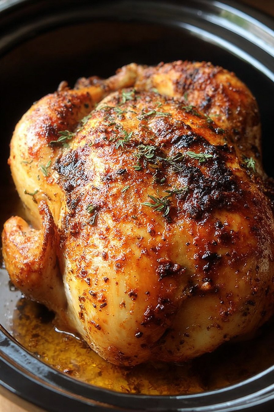 I make this when the day runs long and the house needs that cozy chicken smell. We tuck a seasoned bird in the slow cooker and let gentle heat do the work. The meat turns tender and the skin can crisp later under a quick broil. Dinner feels calm and the kitchen stays clean. I learned this trick after one too many oven roasts that needed tending. With this method the bird rests snug in the pot and stays moist. We mix a simple rub with salt pepper garlic onion and paprika. Olive oil helps it cling and a splash of broth keeps things from sticking. We like the leftovers for lunch bowls and tacos. I shred some meat into rice with pan juices and add carrots or a crisp salad. Friends say it tastes like a Sunday meal on a weeknight. Simple steps good flavor and very little fuss.