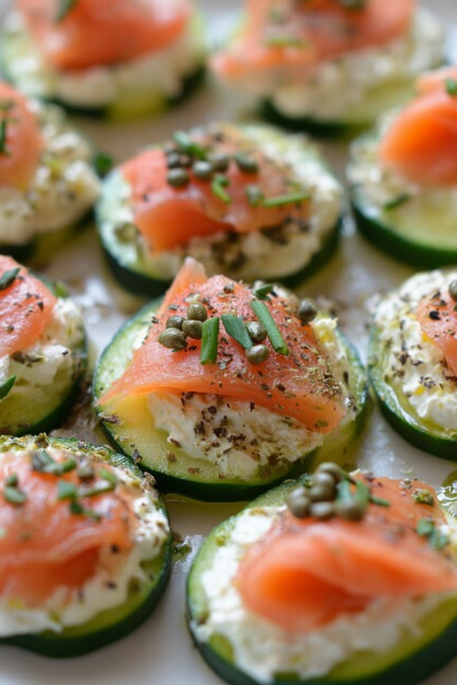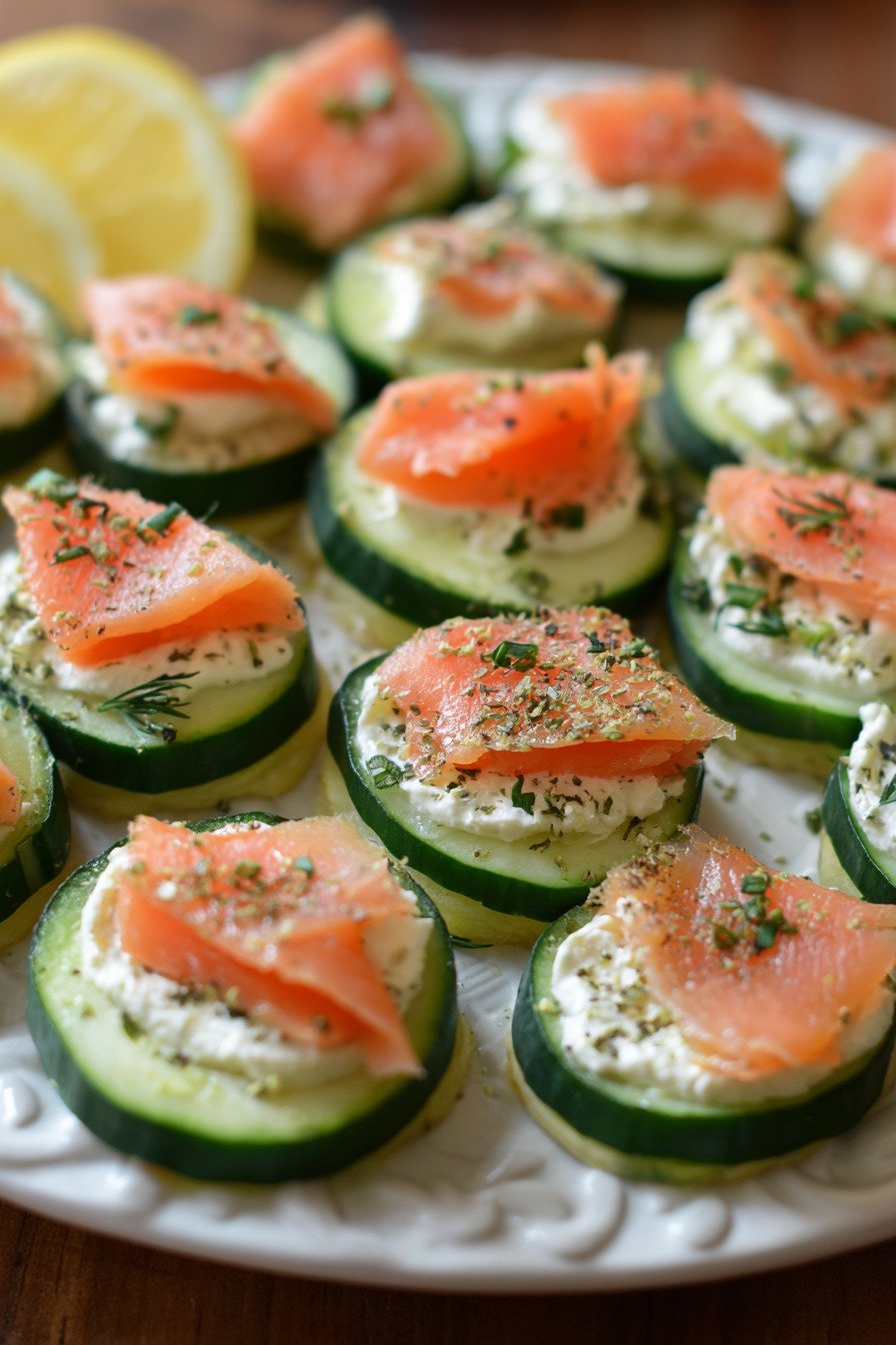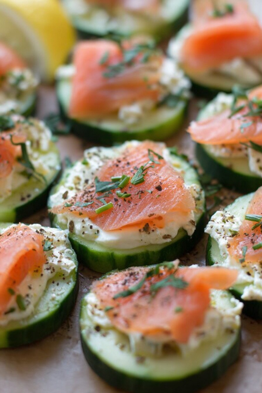 Fresh cucumber carries cool crunch. Smoked salmon brings gentle salt and rich depth. Creamy spread ties it all together. The bites feel light yet satisfying. They look neat on a tray. Guests reach for seconds. I do too.