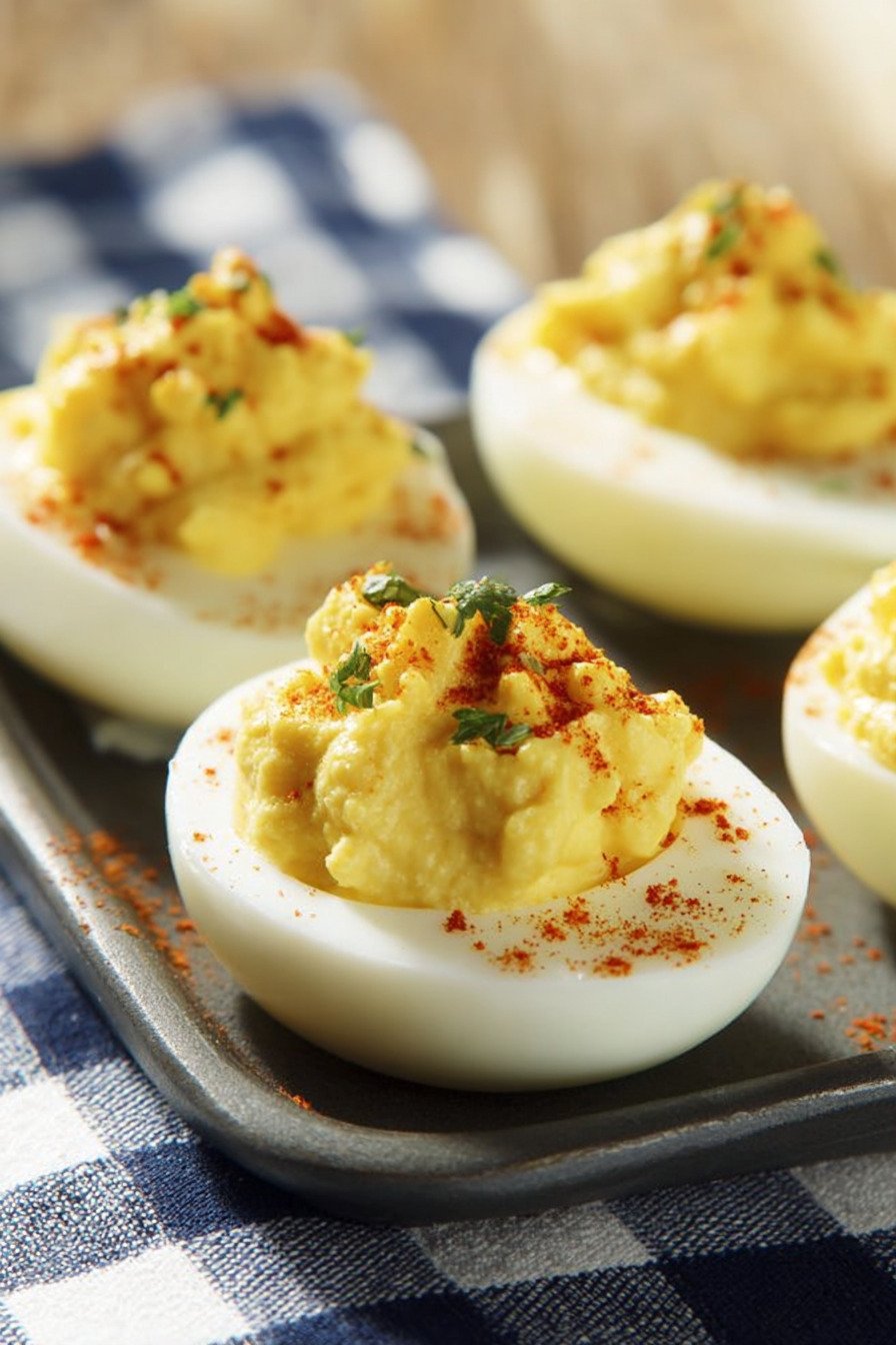 When you’re ready to serve, simply pipe or spoon the filling into the egg whites and garnish with paprika. This quick assembly ensures the deviled eggs look and taste freshly made.