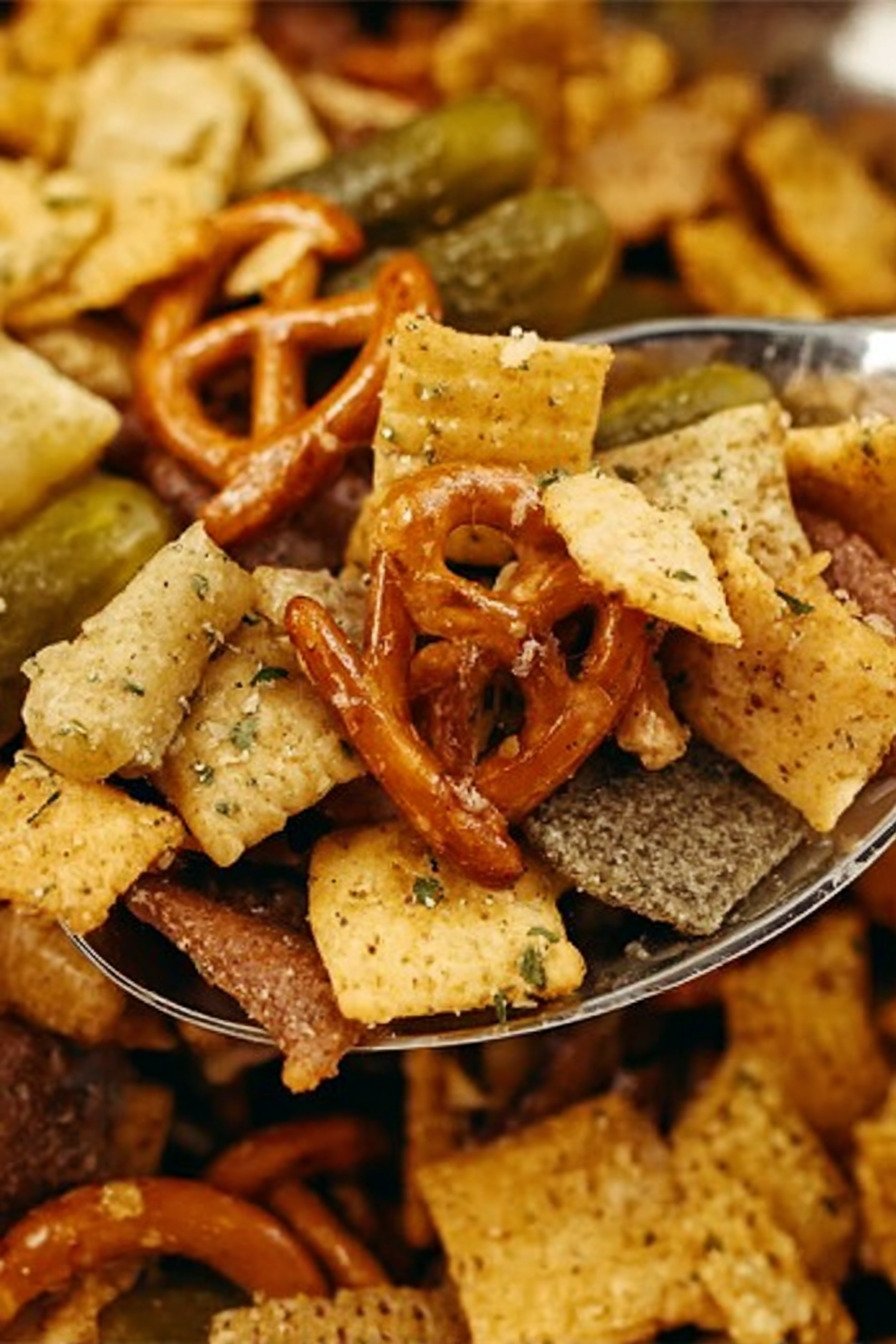 Chex Cereal Chex cereal forms the crunchy base of this recipe and is essential for classic Chex Mix Recipes. It absorbs the flavorful seasoning while staying crispy, creating the perfect foundation for this dill pickle snack mix.