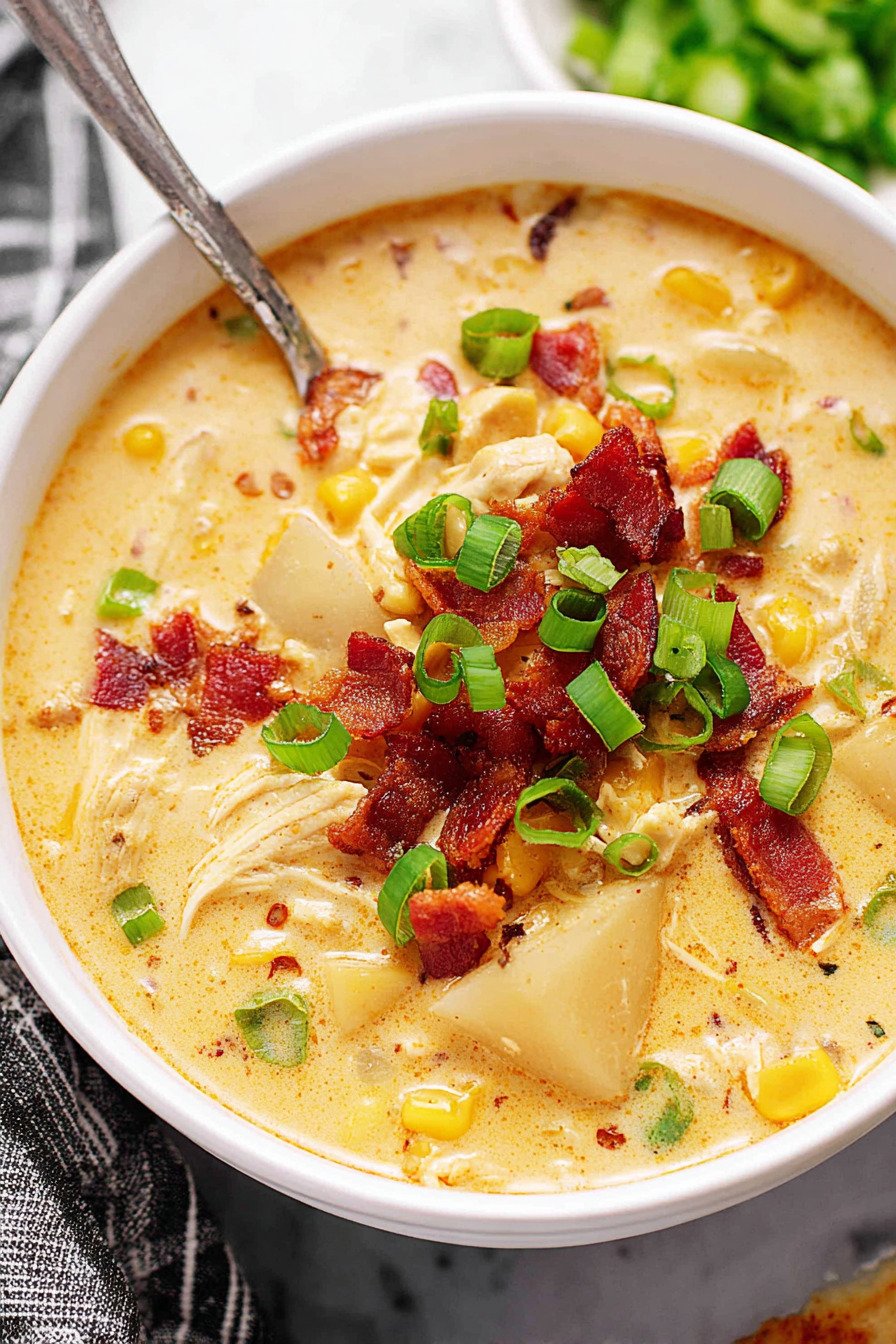 You can also prep this as a corn chowder recipe crockpot variation by assembling the broth, vegetables, potatoes, corn, and chicken in advance. Store the dairy separately and stir it in near the end of cooking so the chowder stays creamy rather than heavy.