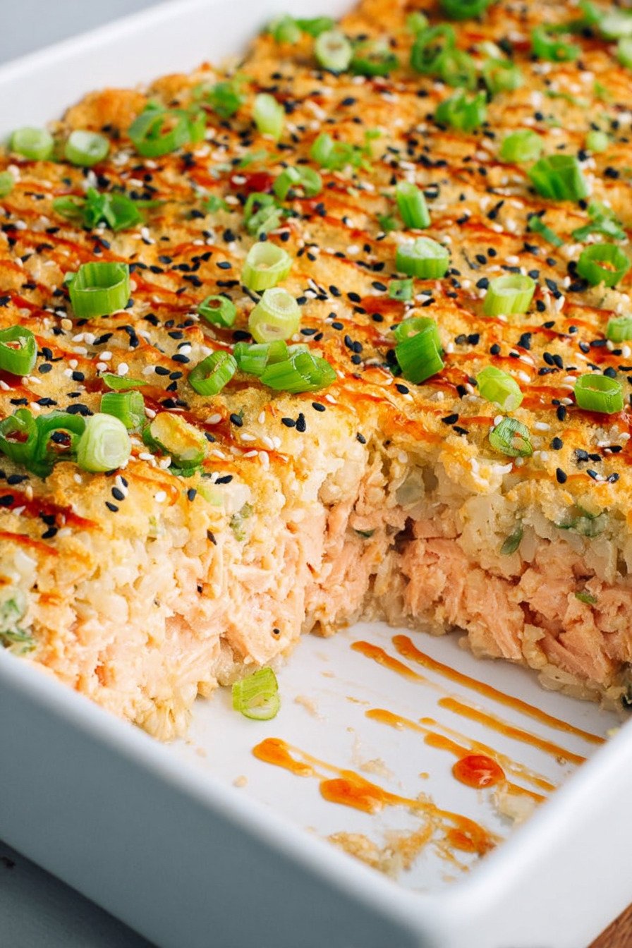 Sushi Rice Sushi rice forms the base of this baked dish and provides the perfect sticky texture needed for layering. It absorbs the savory flavors of the toppings and balances the richness of the salmon mixture.