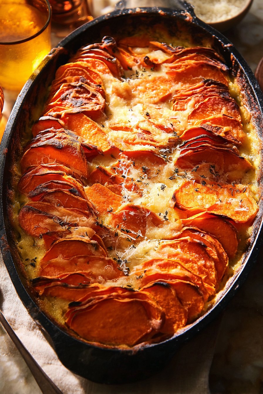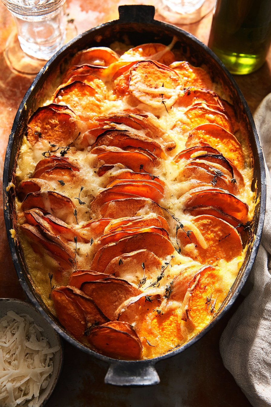 Build flavor in layers. Salt the sauce. Season the slices. Taste the cream before it meets the potatoes. Small steps add up to big comfort. For fans of easy scalloped sweet potatoes and creamy garlic sweet potato bake this approach lands a steady result.