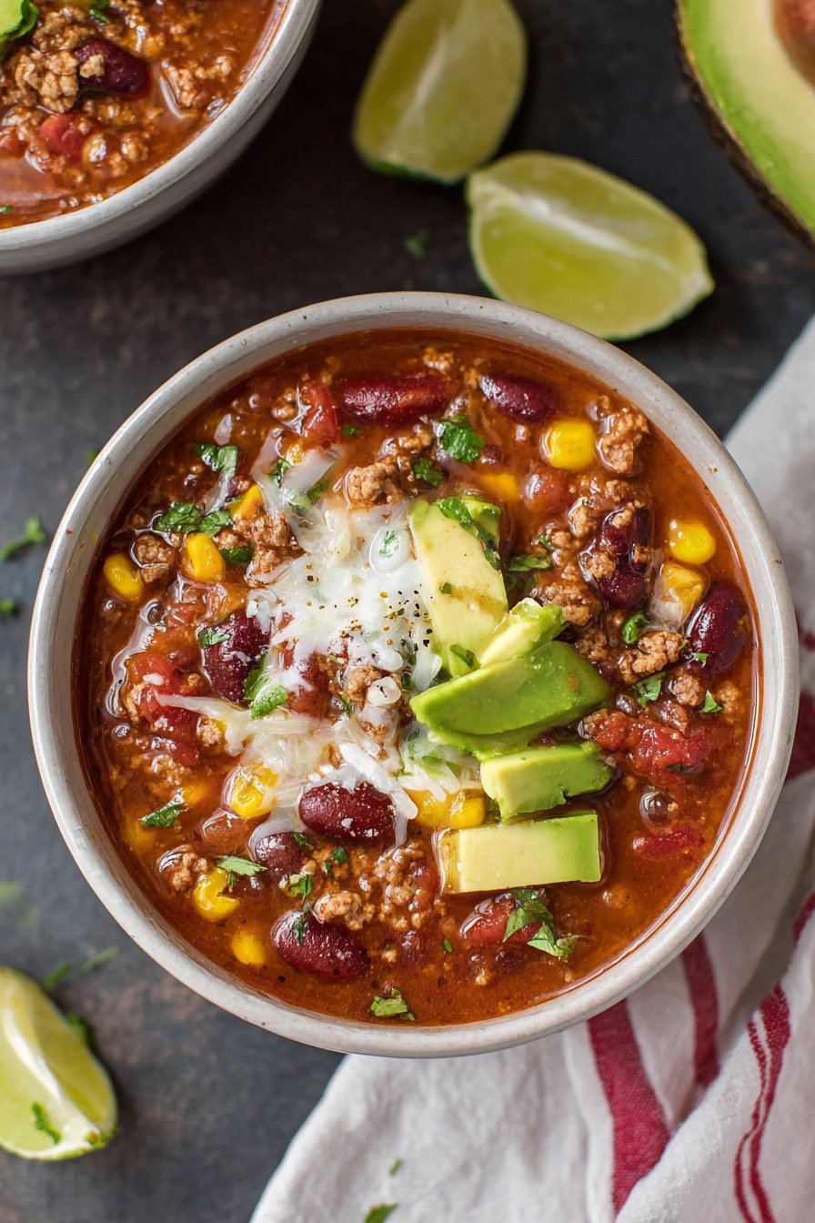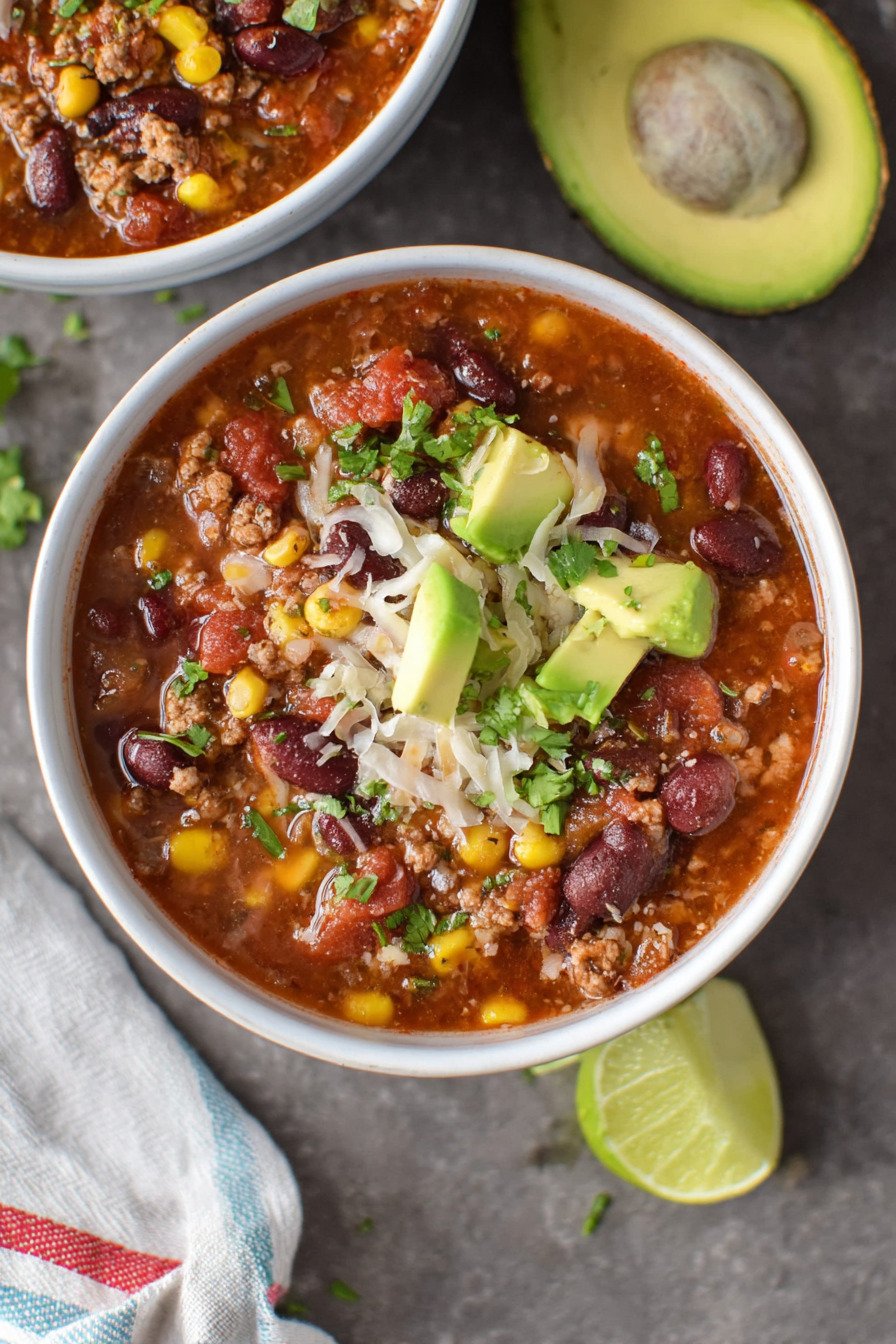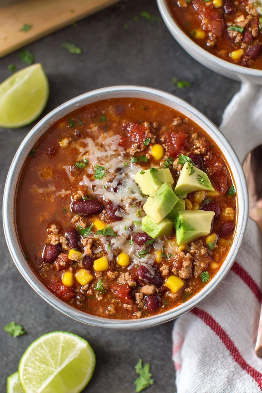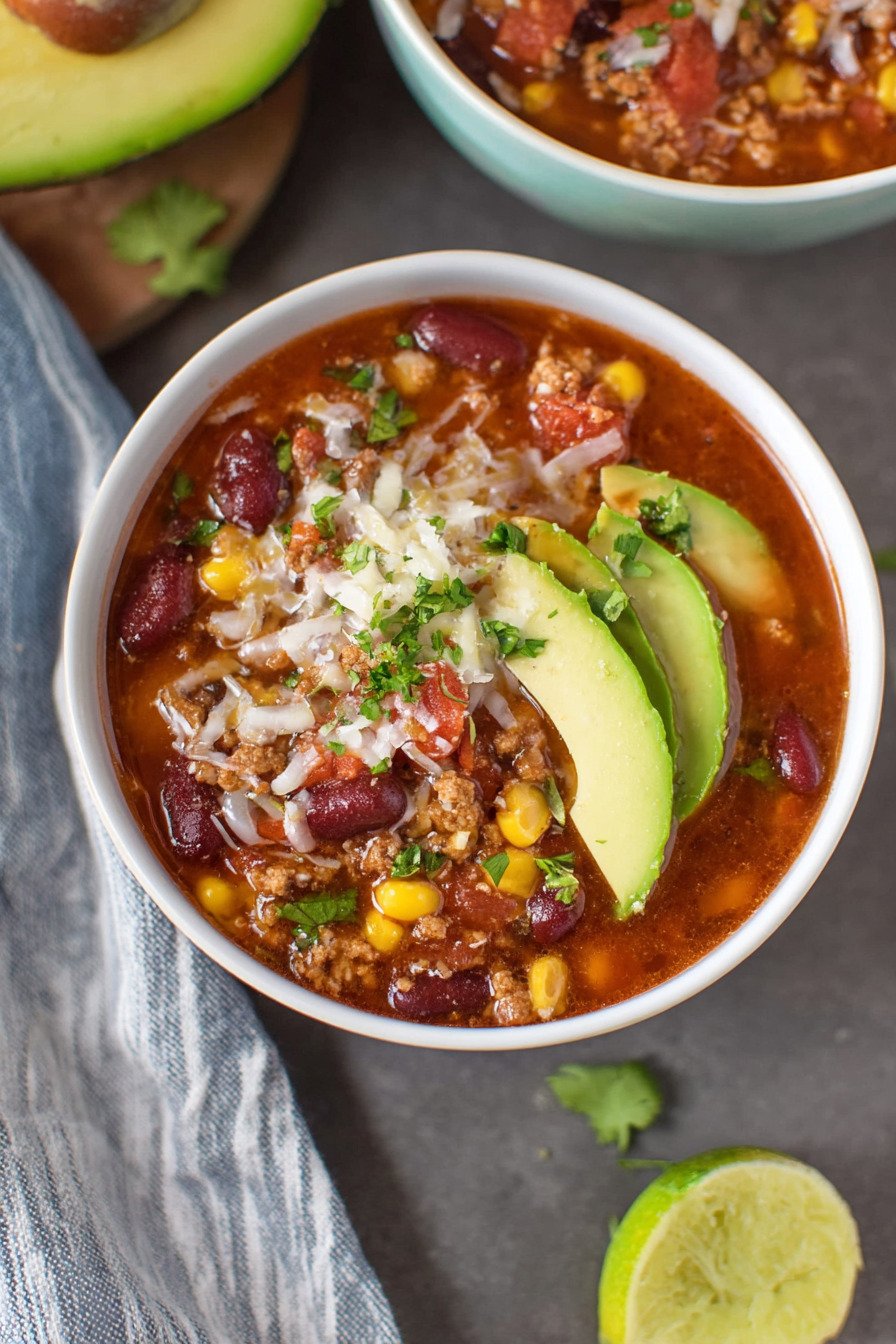 If you enjoy heat, add chopped jalapeno or extra chili powder. If you want a lighter bowl, swap beef for turkey. This flexible taco style soup adapts to your mood.