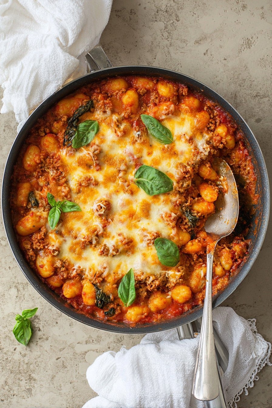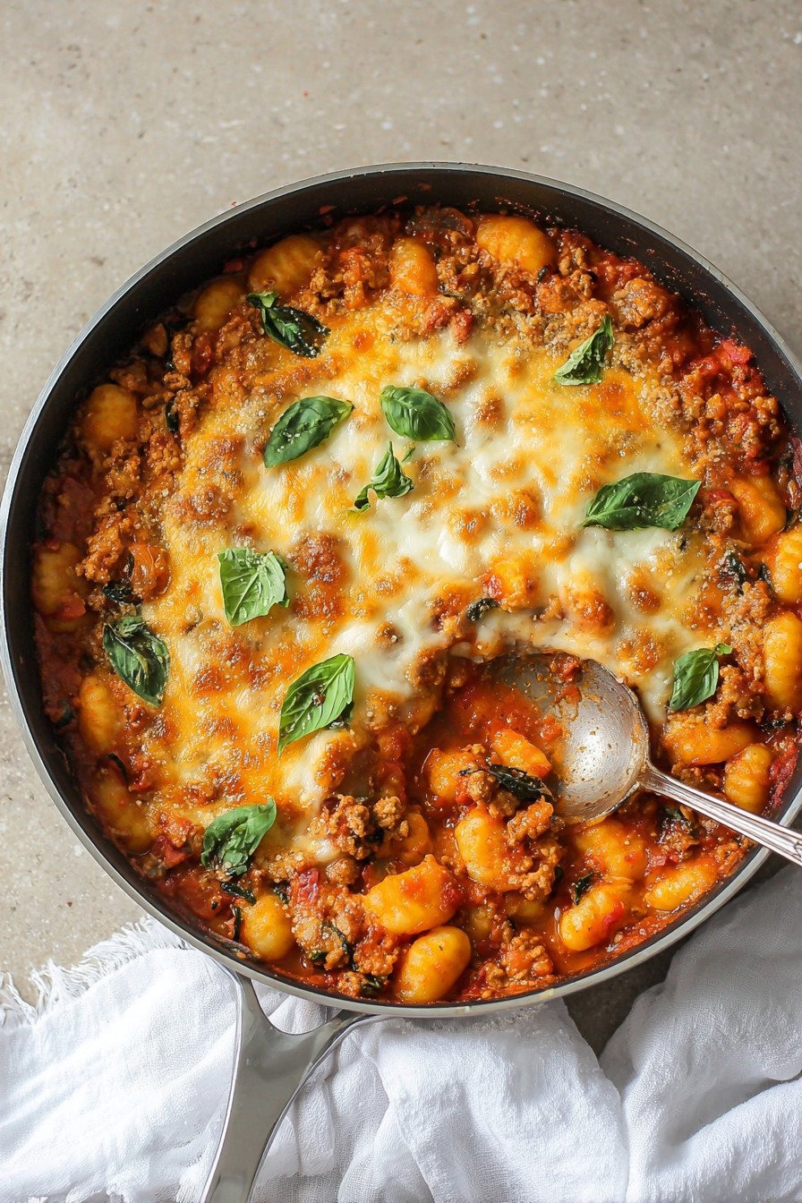 The sauce tastes rich and bright. Ground turkey browns and gives body. Marinara brings sweet tomato. Spinach slips in and softens. A layer of mozzarella melts and pulls. The edges bubble and invite a fork. Short list. Big mood. Easy gnocchi fits busy days.