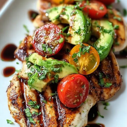 • Quick and flavorful grilled chicken topped with avocado and tomatoes.