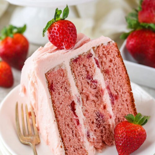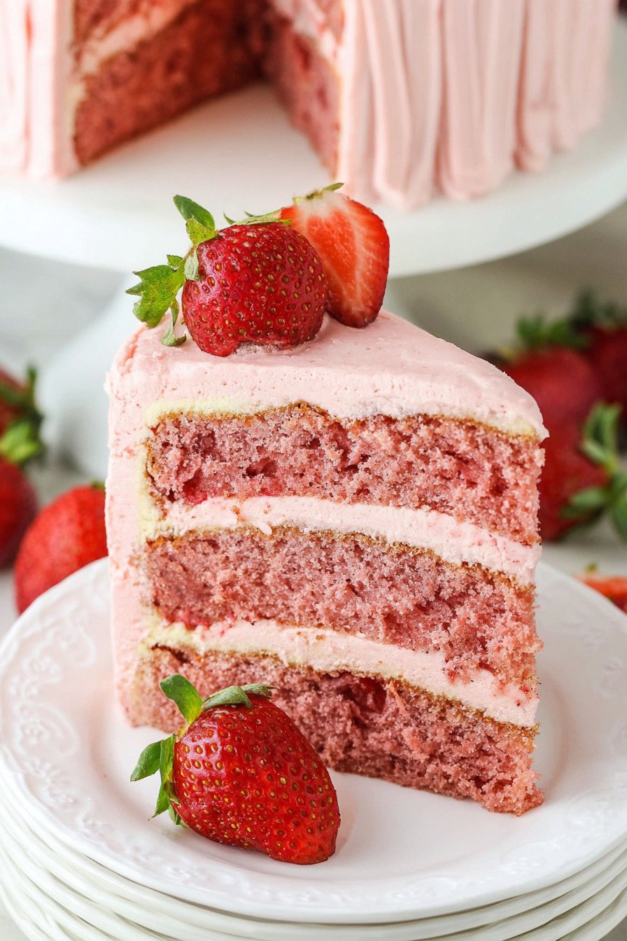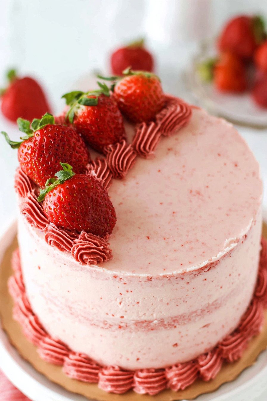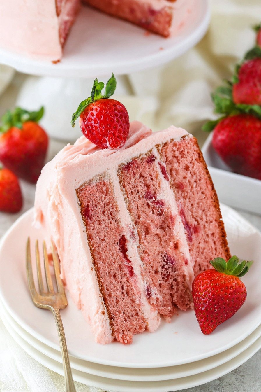Fresh Strawberries Fresh strawberries are the heart of this recipe. They provide the natural sweetness and bright flavor that makes strawberry cake so irresistible while giving the cake its beautiful pink color.