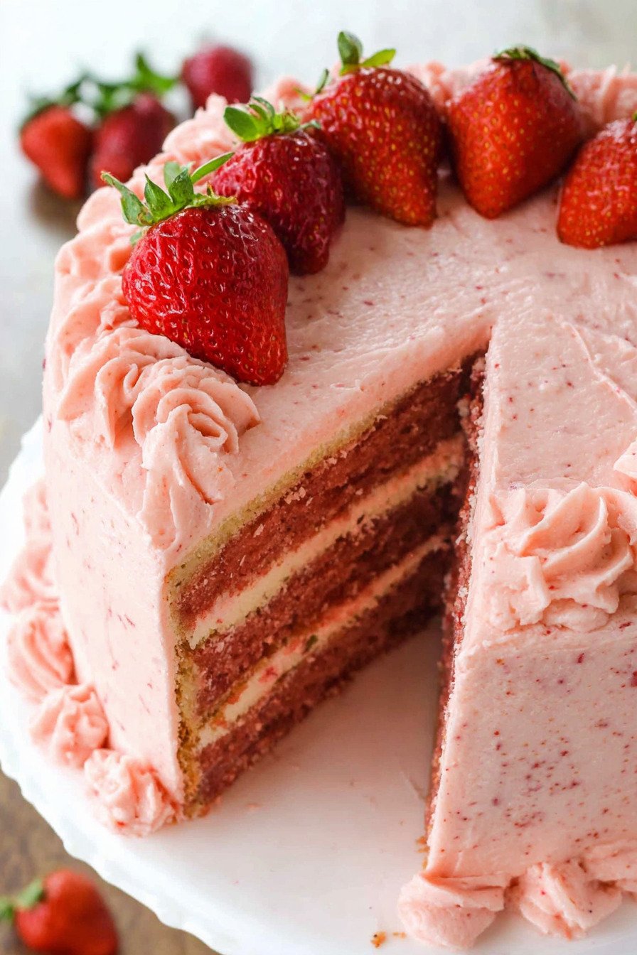 Cream Cheese or Buttercream Frosting A creamy frosting completes the dessert. Many bakers use a classic strawberry cake icing recipe to enhance the berry flavor.