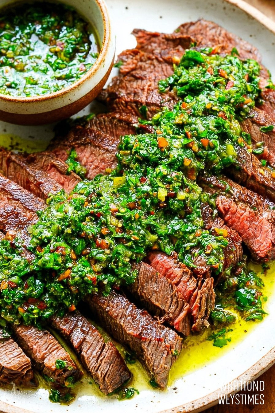 This recipe draws inspiration from traditional Argentinian steak recipes, where grilled meats are paired with bright, herb-forward sauces. The Chimichurri sauce recipe combines fresh parsley, garlic, olive oil, and vinegar to create a tangy topping that also works beautifully in Steak marinade recipes. The balance of smoky grilled steak with herbs and fresh acidity makes it irresistible.