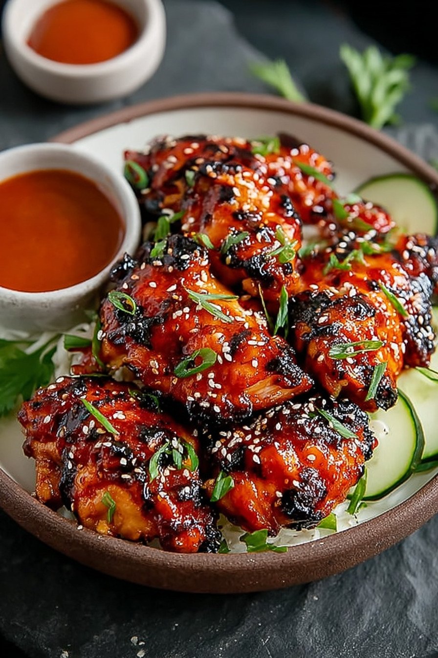 I make these Korean chicken thighs when I want dinner to feel bold and still feel simple. We use boneless thigh recipes when we need speed, and the meat stays juicy. The sauce hugs every bite. Sticky heat meets gentle sweet from gochujang and honey. The air fryer gives crisp edges and tender centers. We cook this for friends who ask for Korean Food Recipes and then ask for seconds. If you enjoy Korean Dishes Recipes you will like this. I tried bone in chicken thigh recipes air fryer on a busy night and it worked too. We toss the thighs in the bowl and the marinade clings fast. The kitchen smells warm and a little smoky. I keep it light and call it healthy korean recipes since the fat drips away. We stack a few cucumber slices on the plate and sprinkle sesame. For weeknights I lean on Korean Food Recipes Easy so cleanup stays short. If you want a gateway dish for easy asian chicken recipes this one fits. We plate, we taste, we grin. That is the promise.