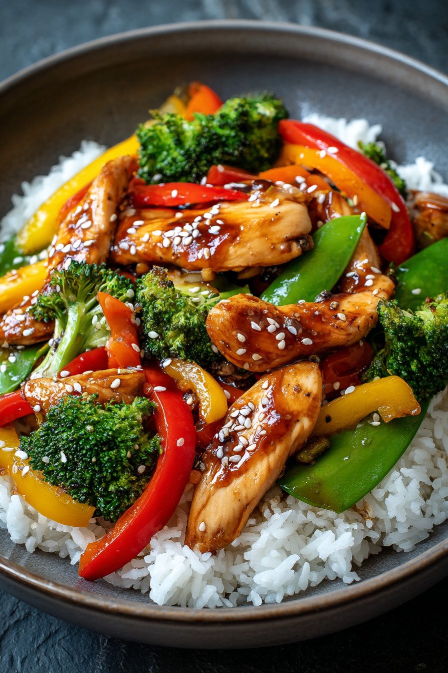 Sauce control Mix cornstarch with cool water every time you cook this. The starch likes to settle. A quick whisk keeps the texture silk smooth which matches the goal of a low calorie chicken stir fry bowl that feels light but not thin.