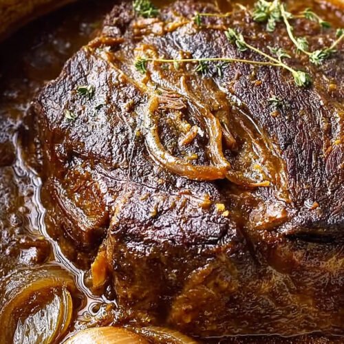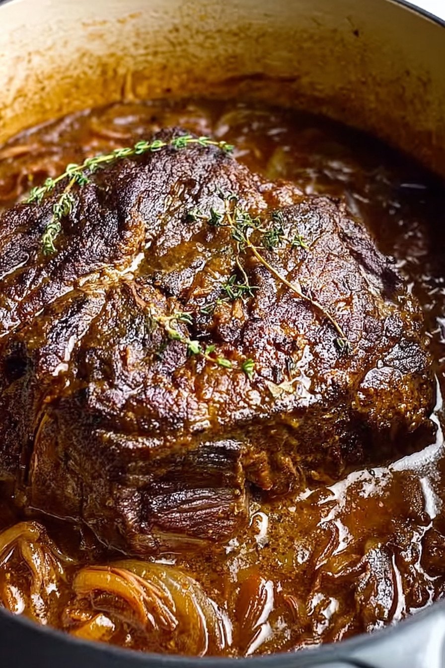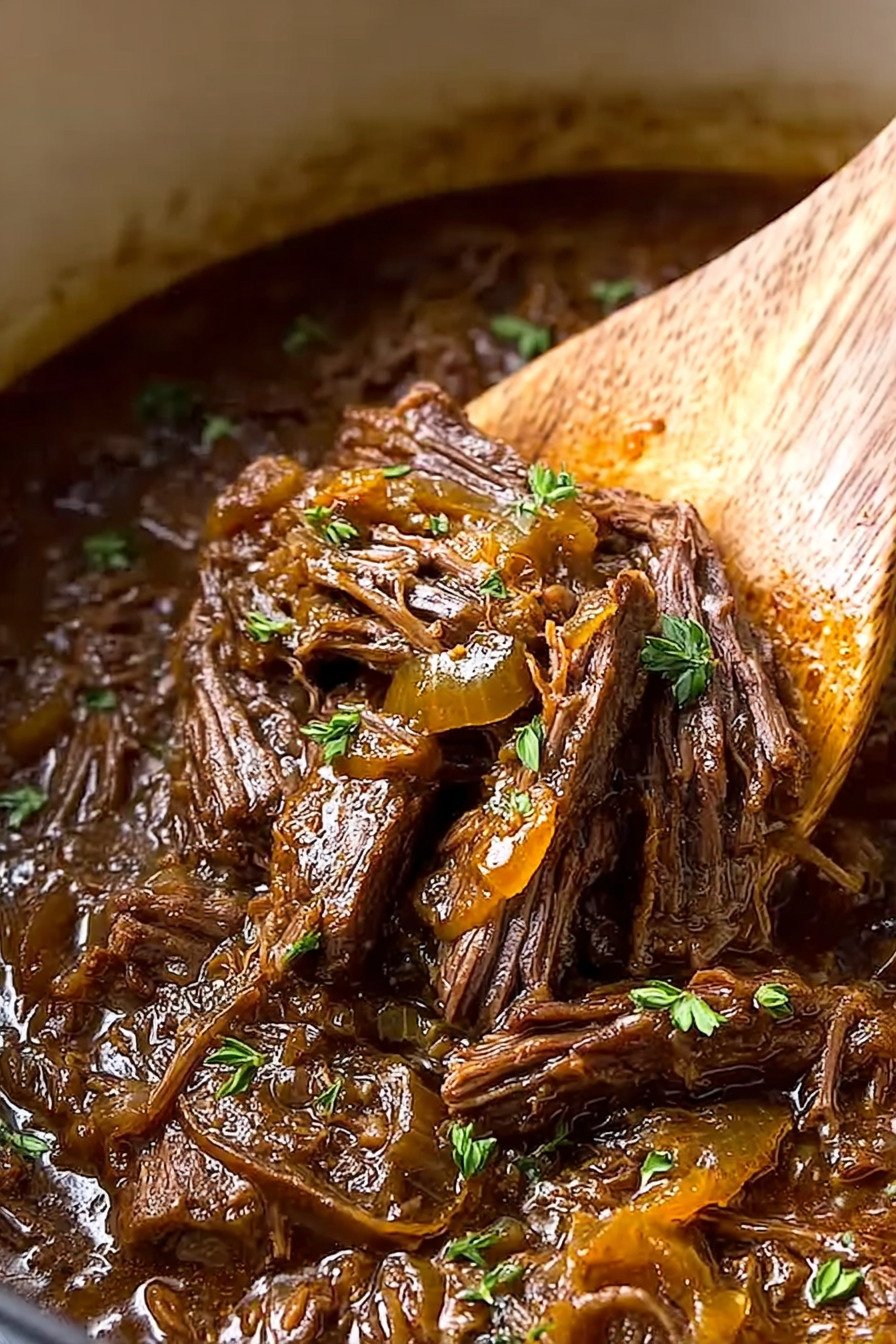 Slice onions thin so they melt into the sauce. If the pot looks dry add a splash of broth and let the onions soften before you add the roast.