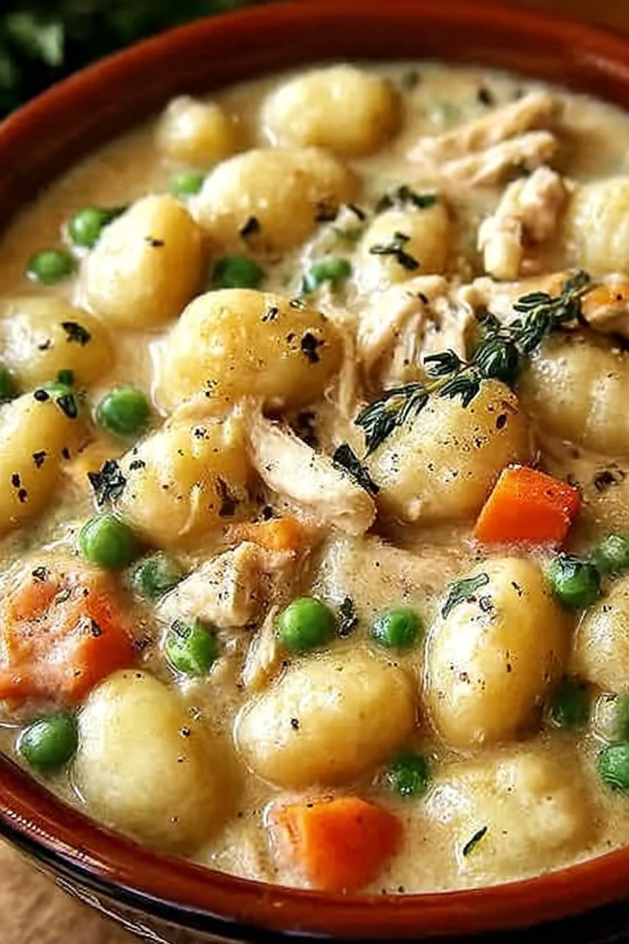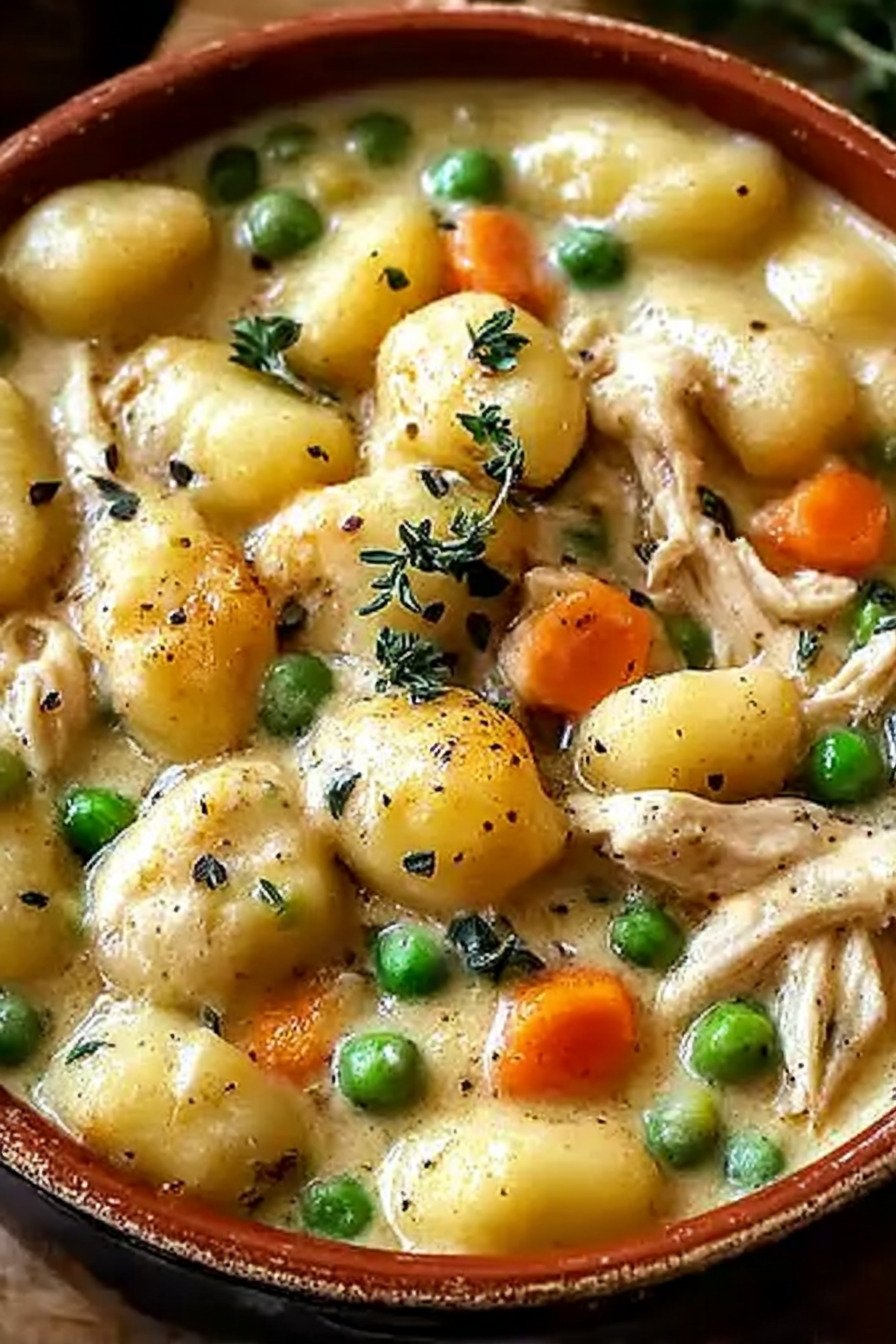 This pot gives a full chicken pot pie vibe in one pan and with no crust. The sauce turns silky from a little cream and starch from the gnocchi. The cook time stays short.