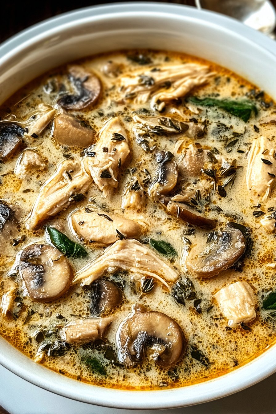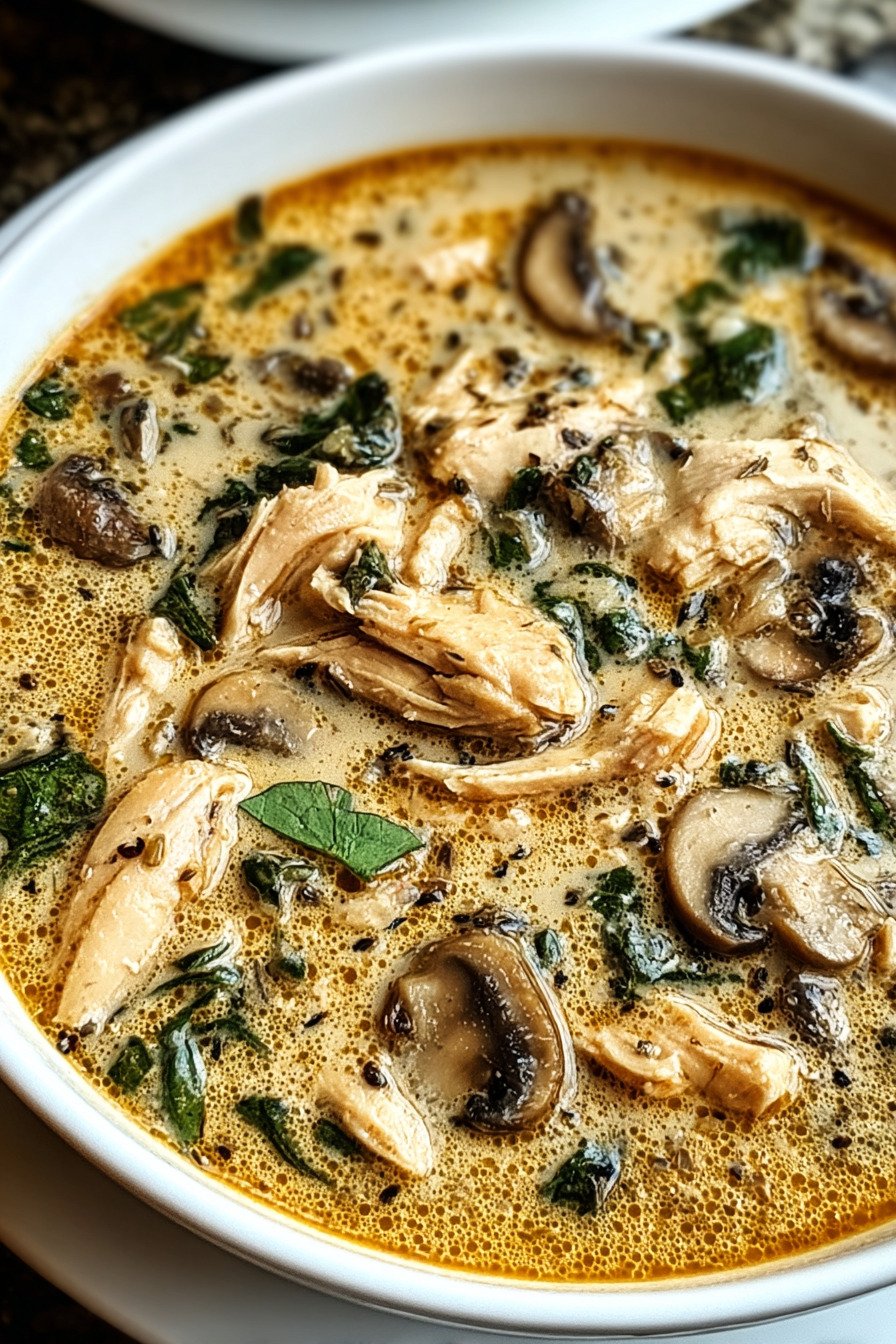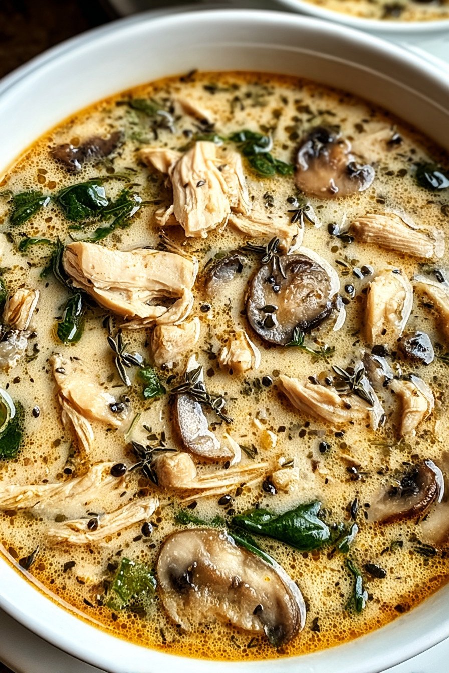 I call this my weeknight rescue. Soup Recipes that actually calm a long day. You get tender chicken, soft mushrooms, and a spoon that keeps finding the bottom of the bowl. The steam smells like home and the first sip feels kind. We start with mushrooms that sizzle in butter. Then onion and garlic join the party. Shredded rotisserie chicken slides in and turns rich stock into comfort. It lands between mushroom soup recipes and chicken soup recipes, and it borrows a little cream of mushroom soup energy without the can. It works for rotisserie chicken recipes and easy mushroom soup fans. It even scratches that homemade chicken soup itch when time runs short. I make this when I crave simple food and a clear sink. No fussy tricks. Just warm broth, fresh thyme, and a handful of spinach for color. If someone shows up hungry, we share. If not, I stash a jar for tomorrow and call it a win.