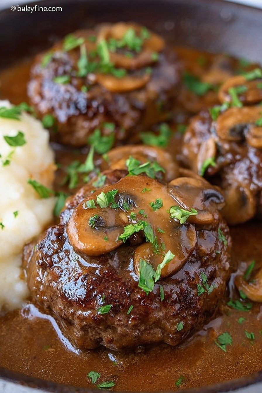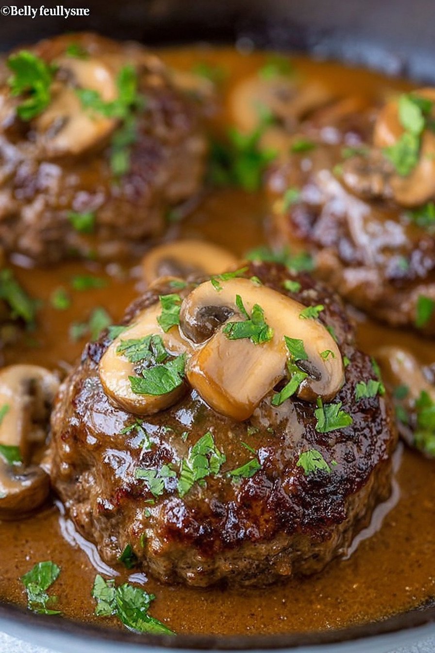 Step six finish Slip the patties back into the gravy. Simmer until the sauce coats a spoon and the meat reads done. Sprinkle parsley and serve hot.