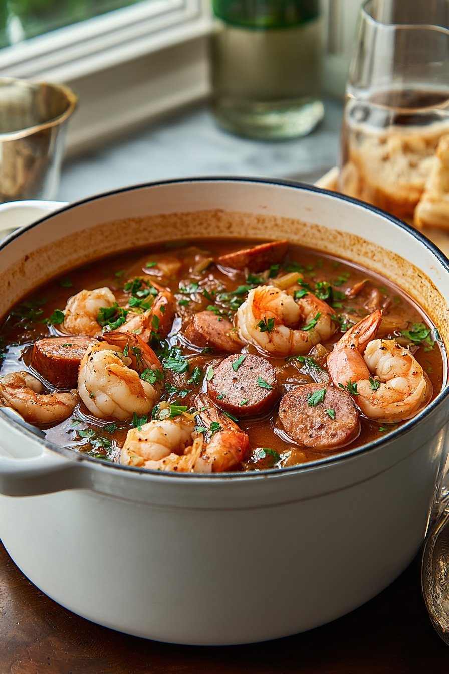 Hold the shrimp back until the end. They stay plump and sweet. Slice sausage a touch thick so it keeps a meaty chew. If you crave smoke, brown the slices first and scrape the tasty bits into the pot.
