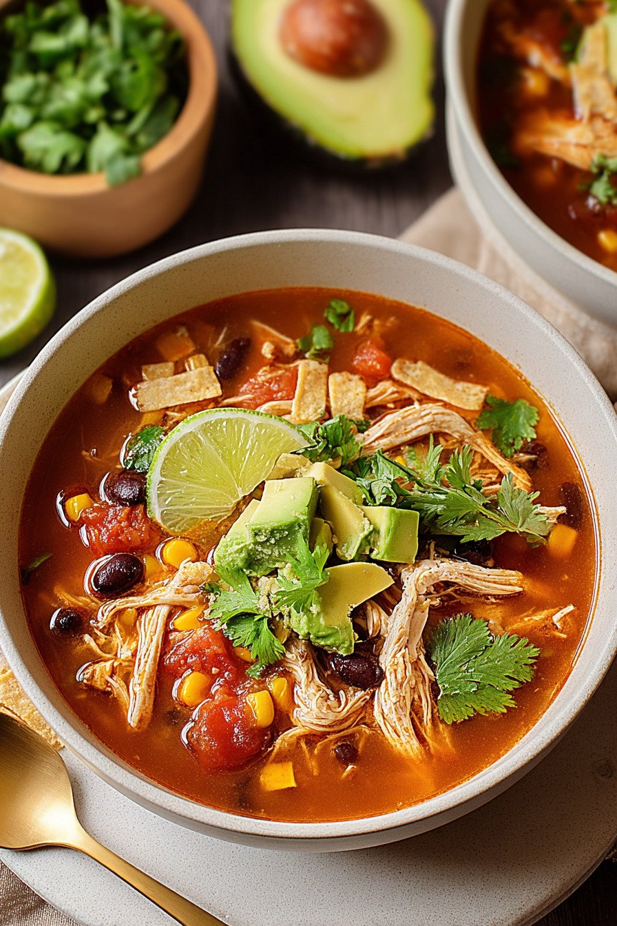 A warm bowl of chicken tortilla soup feels light yet filling. One serving offers balanced protein and fiber from beans and corn. The toppings add fat in a friendly way that keeps us full.