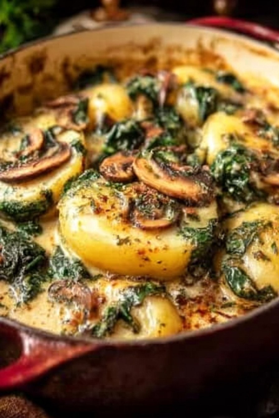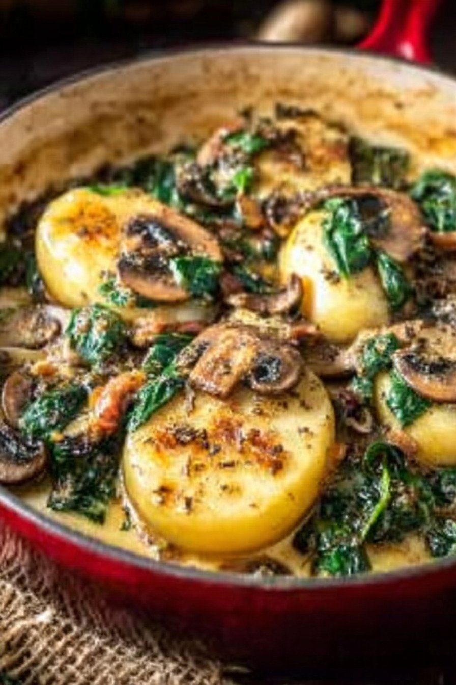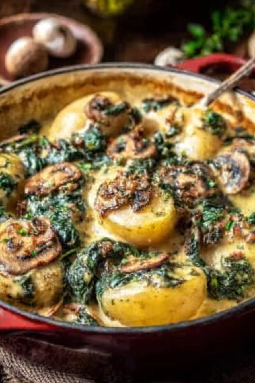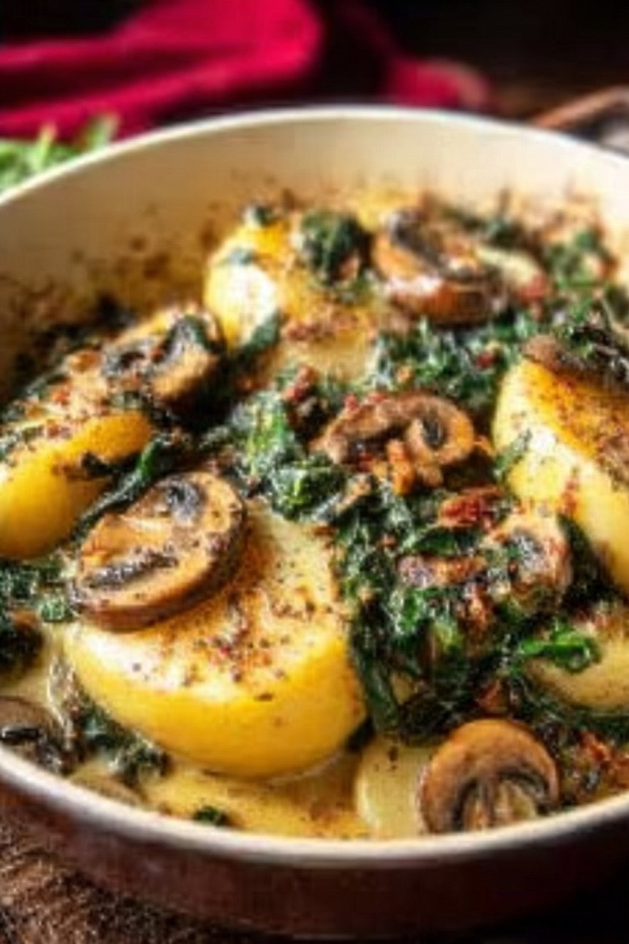 I make this dish on nights when I want something warm and filling that does not feel heavy. These spinach dinner recipes always win at my table. I toss golden potatoes with garlic, add Baked Mushrooms, and fold in fresh greens. It fits right in with Baked dishes and even rivals some of my Best Potato Recipes. When the potatoes hit the hot pan, they sizzle and turn crisp at the edges. I love that sound. It reminds me of Cast Iron Potatoes my mom used to make on Sundays. The mushrooms turn tender and rich, and the spinach melts into the mix. You can spot hints of Carrot And Potato Recipes in the way the flavors layer and build. We keep it simple here. Good olive oil, fresh spinach, real garlic. That is it. Spinach Dinner Recipes like this one prove you do not need much to make dinner feel special. I serve it straight from the skillet and we eat it hot, right there at the counter, talking and laughing between bites.