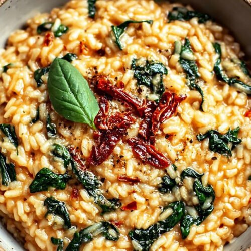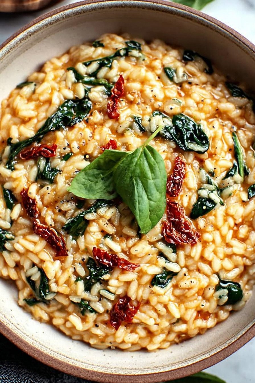 I make this on quiet weeknights when I want comfort that still feels light. Creamy rice hugs tender spinach and bright sun dried tomatoes. It tastes rich but the steps stay simple so I can stir and breathe and let the kitchen smell like dinner. This fits right into spinach dinner recipes and it checks all my boxes for a calm meal. I keep the process steady. A warm pot. A wooden spoon. Small ladles of broth that pull starch from each grain. The tomatoes bring a tang that wakes up the rice. The greens soften and add a clean note. Every bite lands soft then savory. It is one of my favorite creamy spinach recipes and it stands tall among sun dried tomato recipes and risotto recipes. If you need spinach dinner ideas this one works. It suits vegetarian dinner recipes and it ranks high on my easy spinach recipes list. You will taste comfort and a little sparkle in the same bowl and that is why we keep coming back.