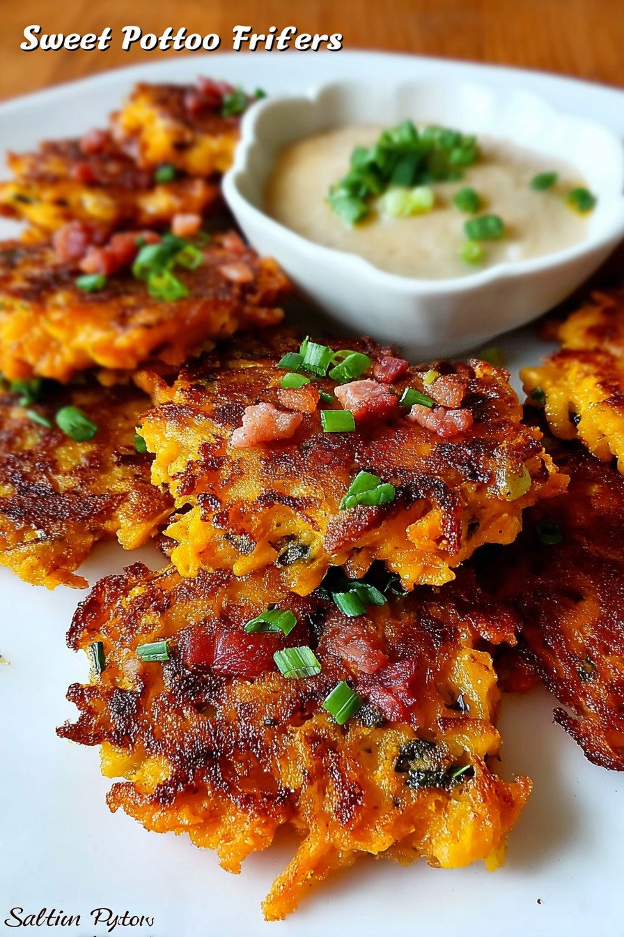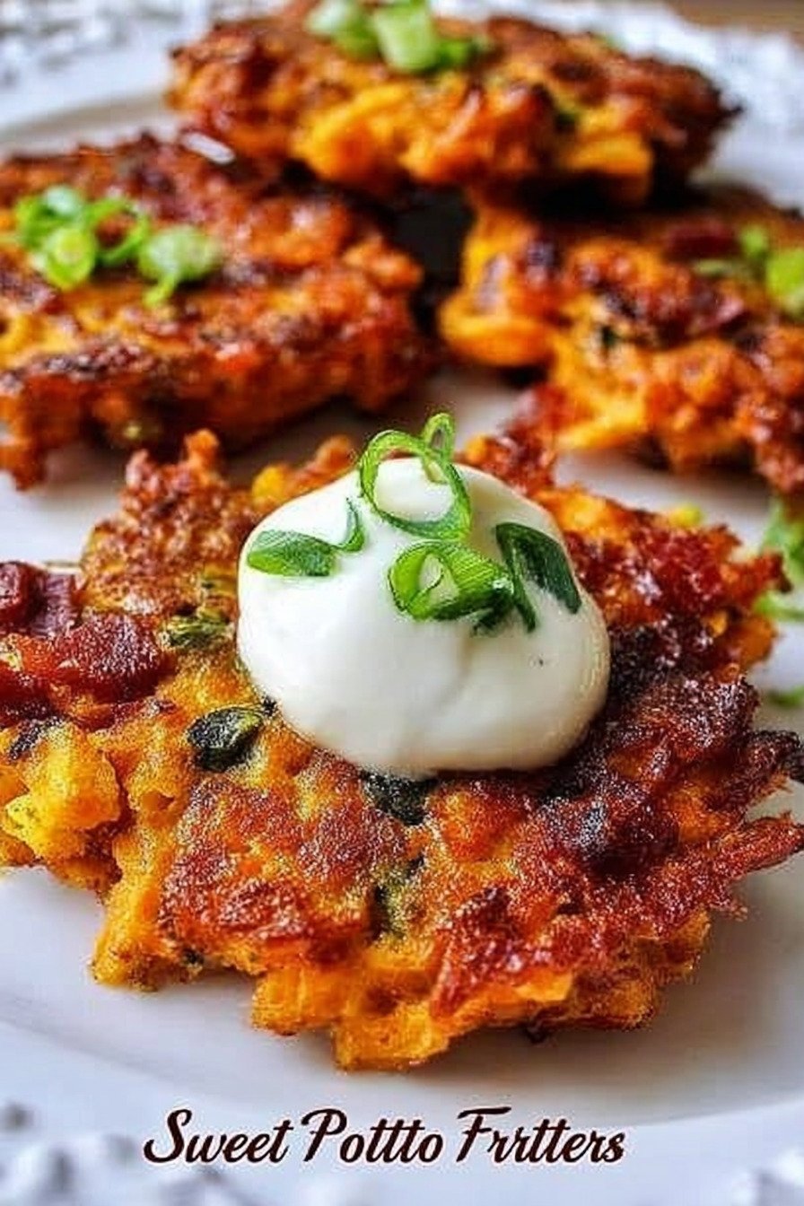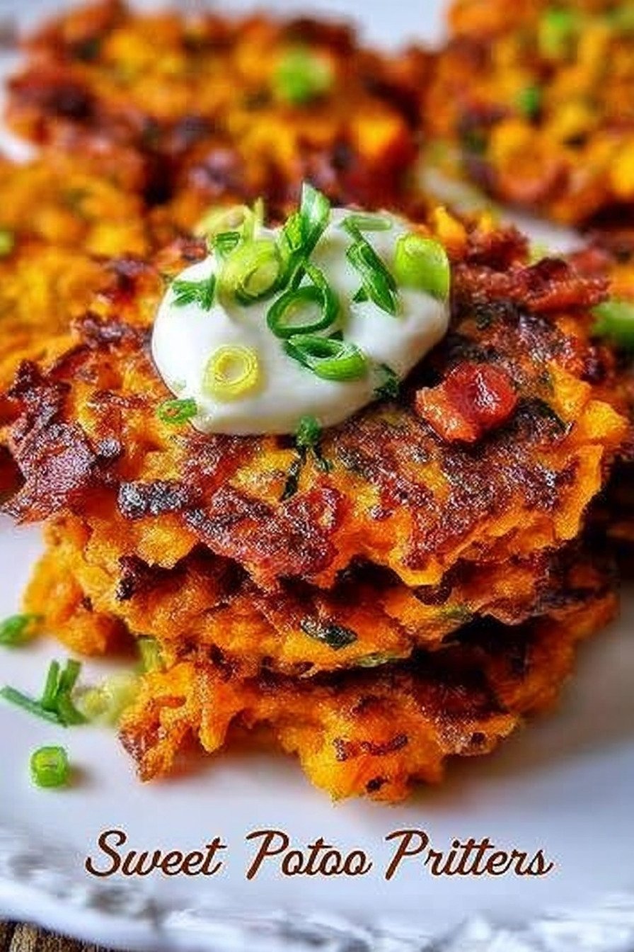 We work with sweet potatoes, a whisked egg, and a short list of flavor. The batter holds together and browns well. Serve as a warm appetizer or a playful side. My family asks for seconds and I plan for that. I stack the finished fritters on a wire rack so the bottoms stay dry and light.