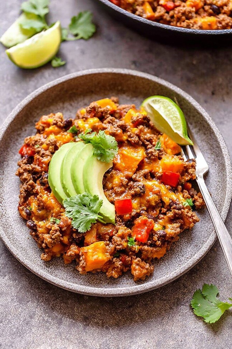 I make this skillet on nights when I want real food and I want it fast. This dish sits right at the heart of sweet potato recipes that feel cozy yet bold. If you love Beef Skillet Recipes, Southwest Recipes, Ground Beef Recipes, a solid Sweet Potato Dinner, easy One Pot Meals, and trusty Cast Iron Skillet Recipes, you will feel at home here. We start with ground beef that sizzles the second it hits the pan. The smell pulls everyone into the kitchen. Sweet potatoes soften and turn golden at the edges. I stir in spices that warm the whole room. It feels simple and honest, the kind of meal you scoop into a bowl and eat at the counter with a fork in one hand. I have cooked this after long days when my brain felt tired. It never lets me down. The beef stays juicy, the potatoes turn tender, and the spices wrap it all together. We top it with avocado or a spoon of yogurt and call it dinner. It is hearty, filling, and made in one pan which means fewer dishes for us later.