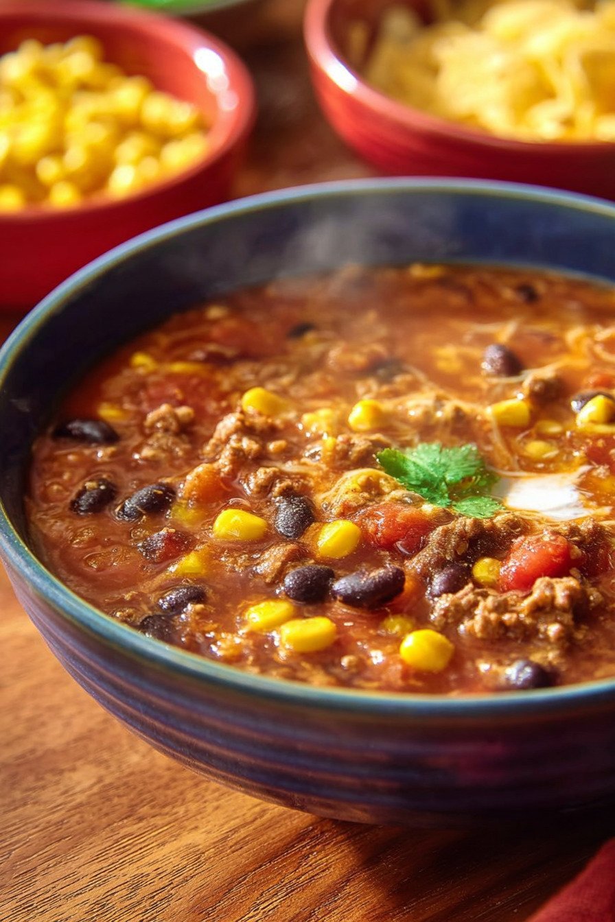 Step 5 Taste and adjust salt or spice. Ladle into bowls and top with cheese, avocado, or crushed chips. We call this our easy taco soup night, and nobody complains.