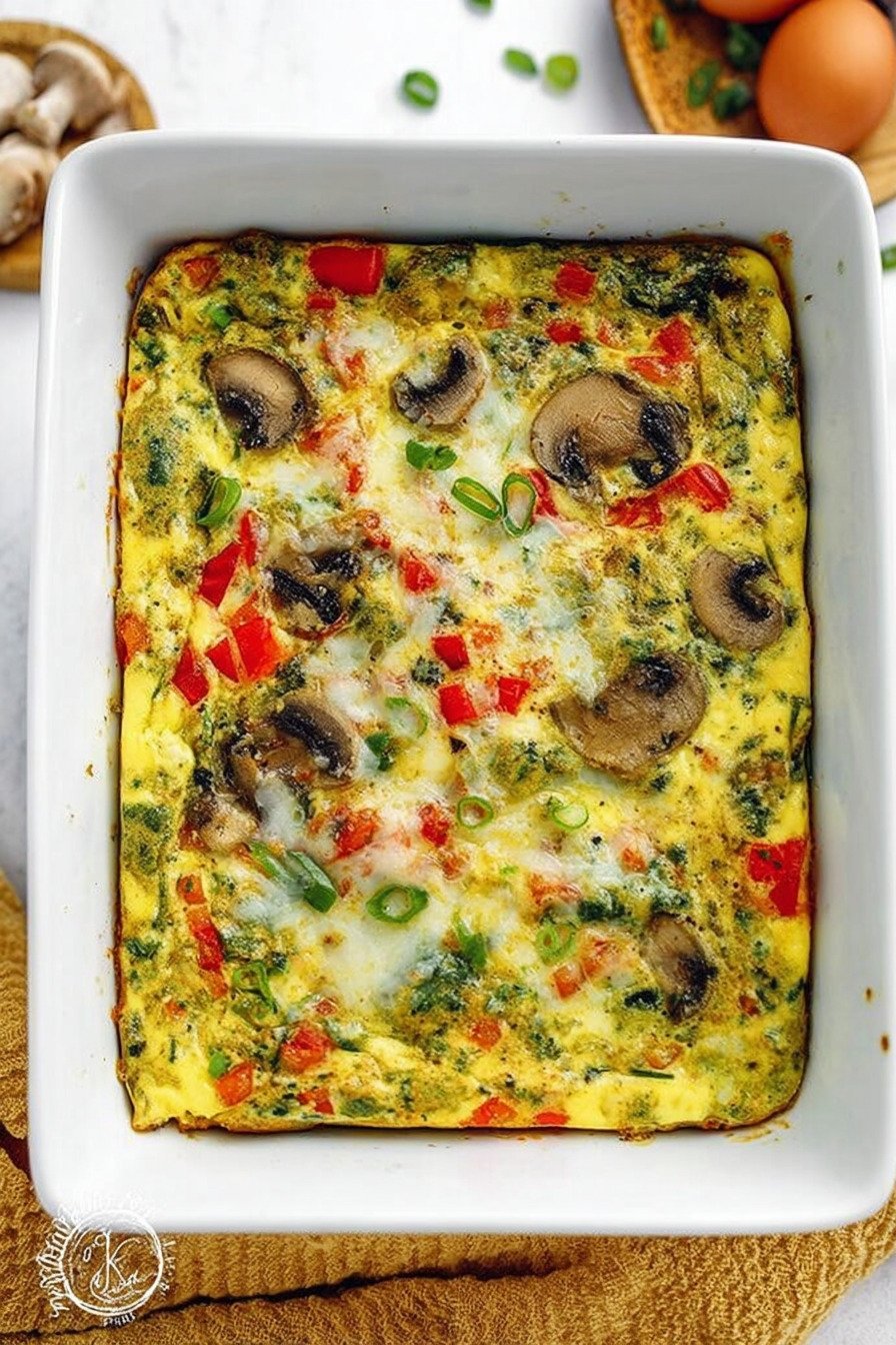 The base uses a smooth tofu blend that sets like a soft custard. Peppers onion broccoli and spinach add color and crunch. A light scoop of Bisquick gives body without weight so each square lifts clean and eats warm or cold.