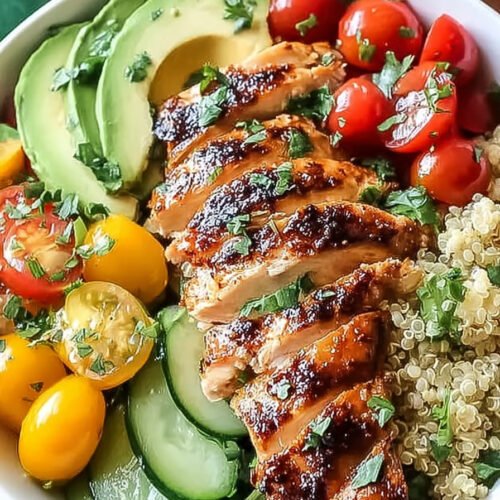 Assemble bowls by dividing quinoa into servings. Top with grilled chicken, avocado, tomatoes, cucumber, and feta.